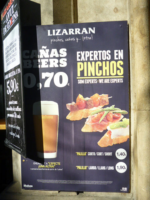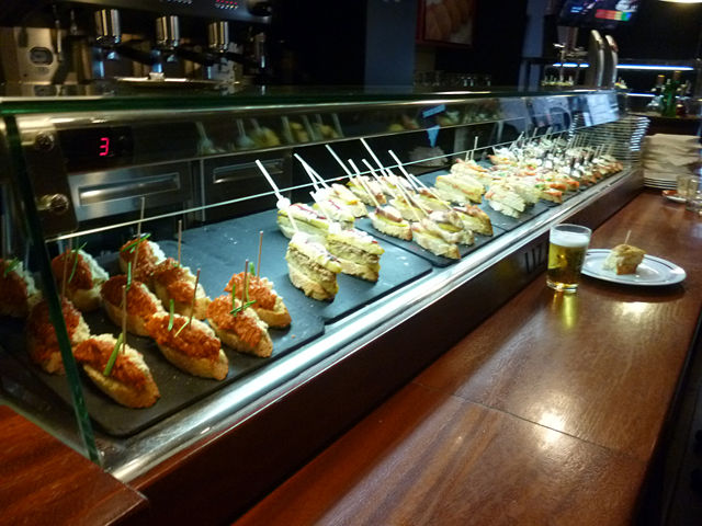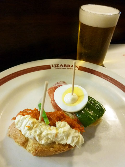 Cervezaくださーい。ピンチョスも2つ選んで。