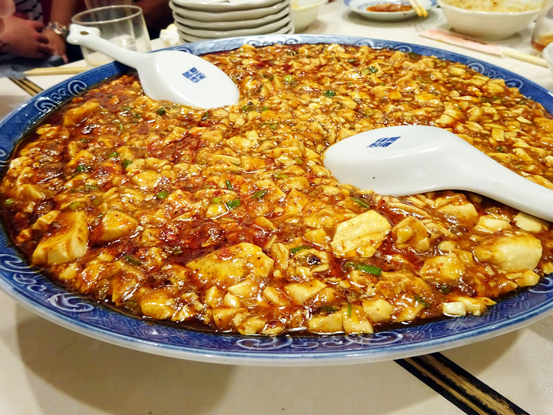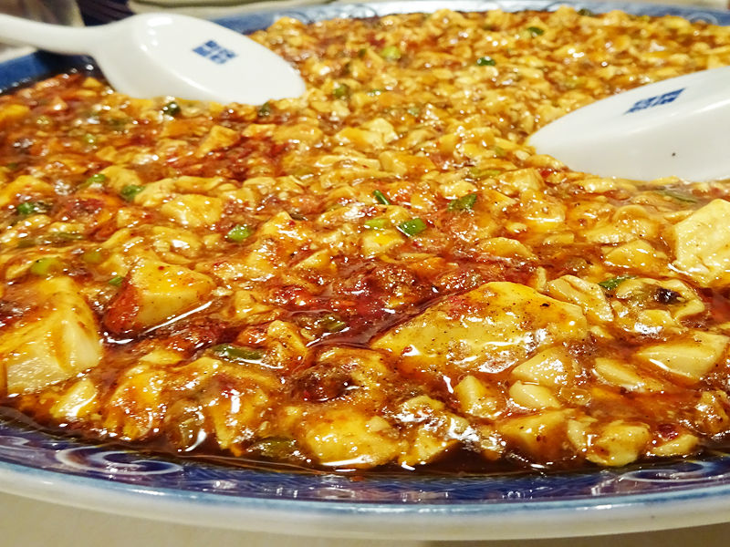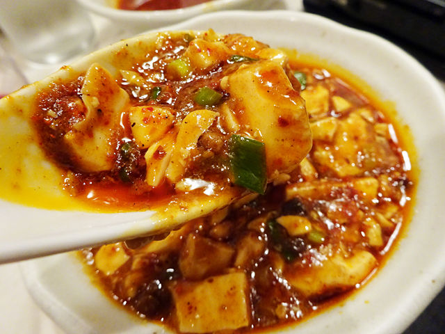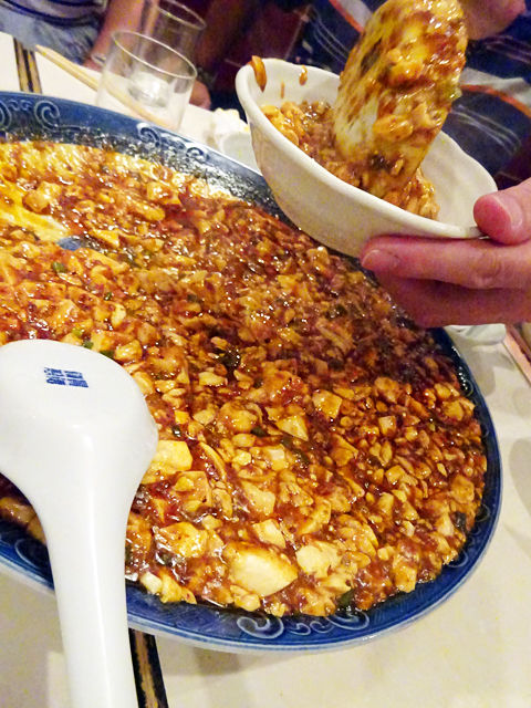 大きなレンゲでよそって。なめらかまろやかな豆腐の味を堪能する間もなく瞬時にビリビリリッ!と麻のしびれる辛さが襲ってきます!まさに四川風。