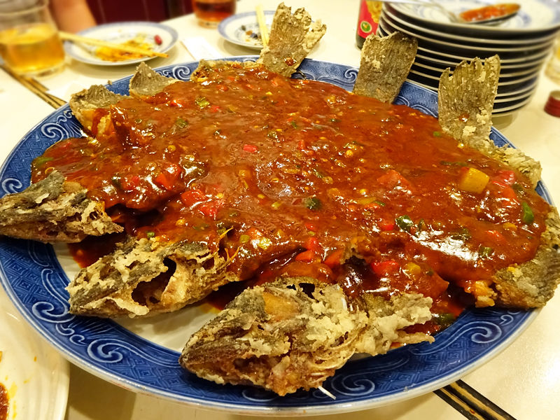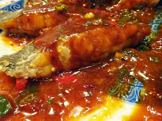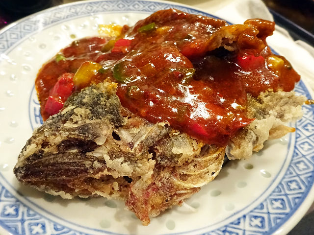 カラリサクサクッと揚がったカレイに、通常は甘酢餡がかかる料理ですが、ただの甘酢ではなく辛みのパンチ全開に仕上がっております。