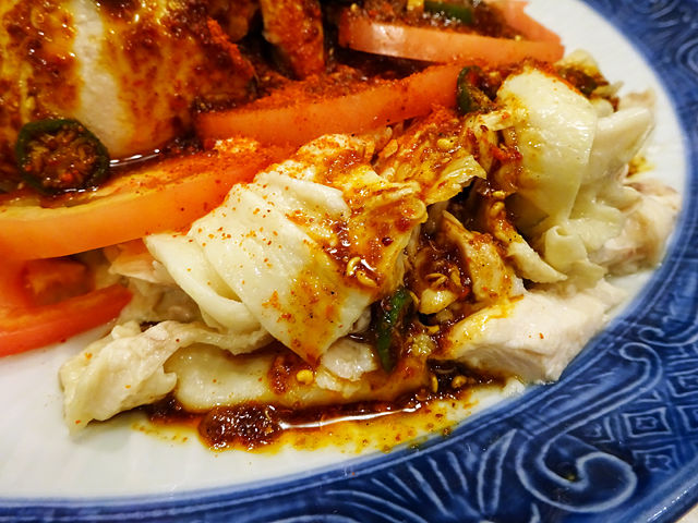 大きめにカットされた蒸し鶏は、皮嫌いの人のために身と分け別盛りで。