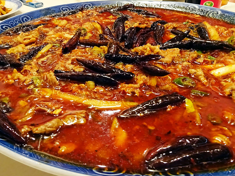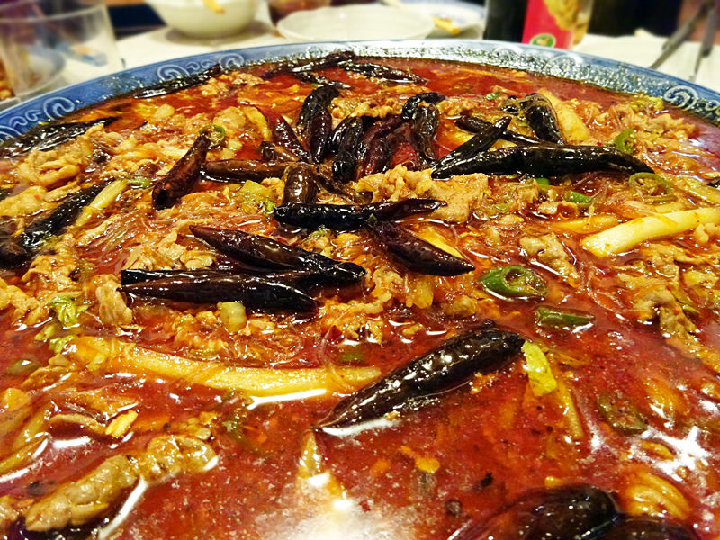 火をつけたら燃えそうなほど真っ赤なスープに、牛肉片と春雨、そして黒い唐辛子がプカプカ浮いてます〜っこれ、今日イチの激辛ビジュアル!