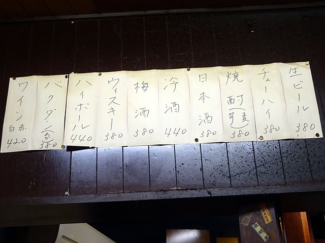 ドリンクは生ビール、チューハイ、焼酎、日本酒など定番ものが¥380、その他、ハイボール、ワイン、冷酒などが¥440と、2段階設定かしらね。