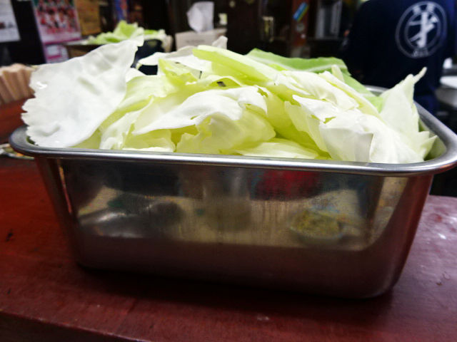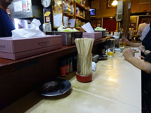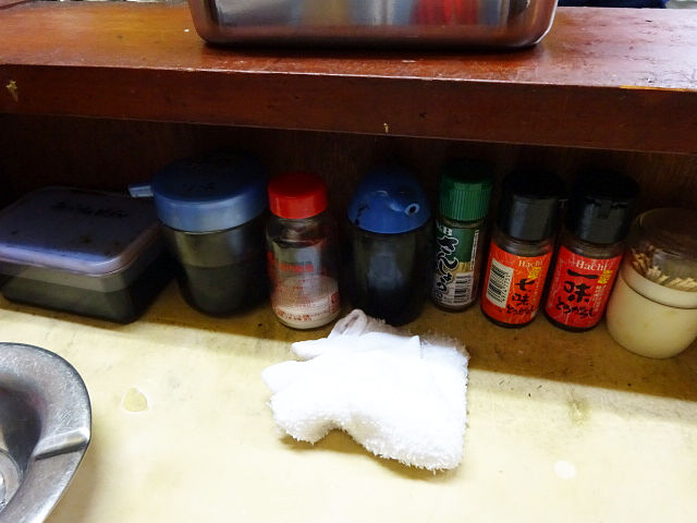 カウンターは2段になっていて、上段にはキャベツとティッシュ、下段奥には各種調味料が各所にスタンバイ。