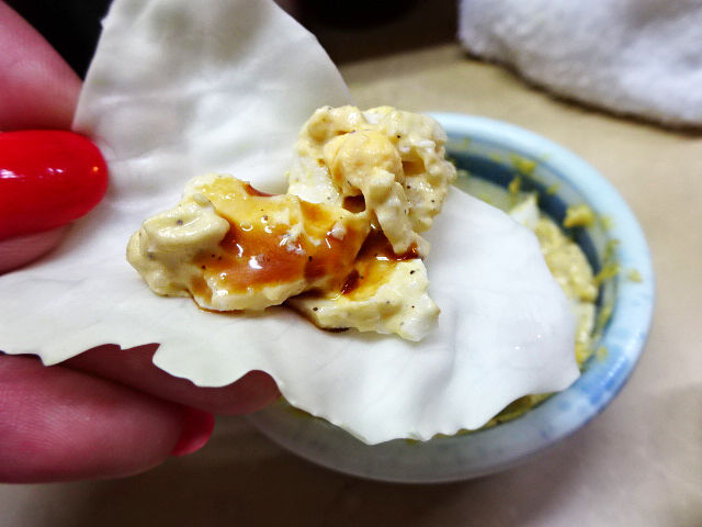 キャベツに玉子サラダをのっけて、もう一枚のキャベツでタレをかけ。