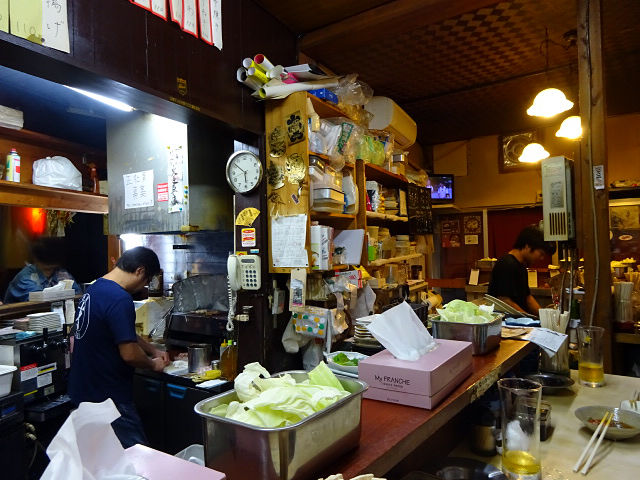 油や煙、ヤニで黒光りする柱・壁、天井から下がるオレンジ電球の花形の傘。