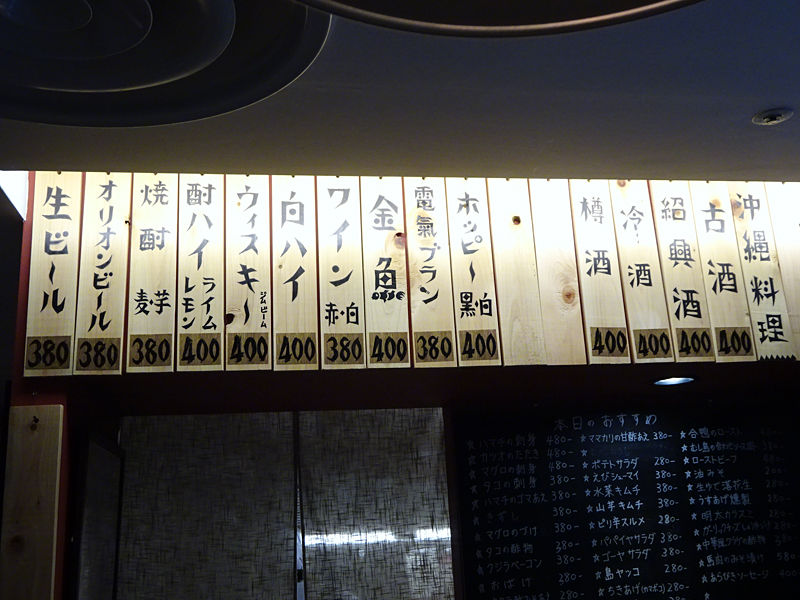 ドリンクは、生ビール、オリオンビール、焼酎、ワインなどが¥380、酎ハイ、ウイスキー、ホッピー、冷酒、紹興酒などが¥400とこちらも2段階。