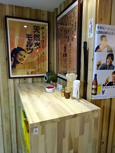 店内は中央をぐるっと囲うカウンターと、入口(?)すぐのテーブル、奥にも壁向かいのテーブルがあります。もちろん椅子無し、オールスタンディング。