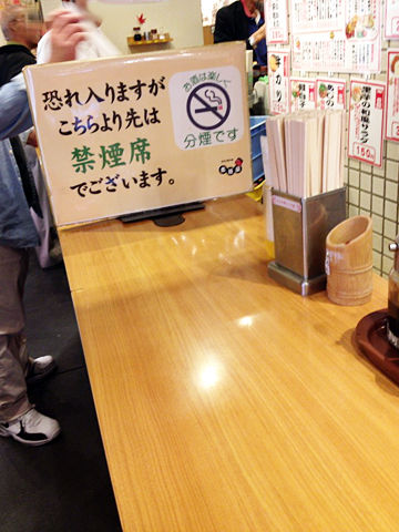 指示された席は店の真ん中かしら。真横はちょうど、喫煙・禁煙の中間地点。(この仕切りって意味あるんかなぁ?w