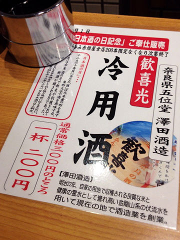 訪問時は冷酒が安く提供されていました。(後で気付いたっ;;