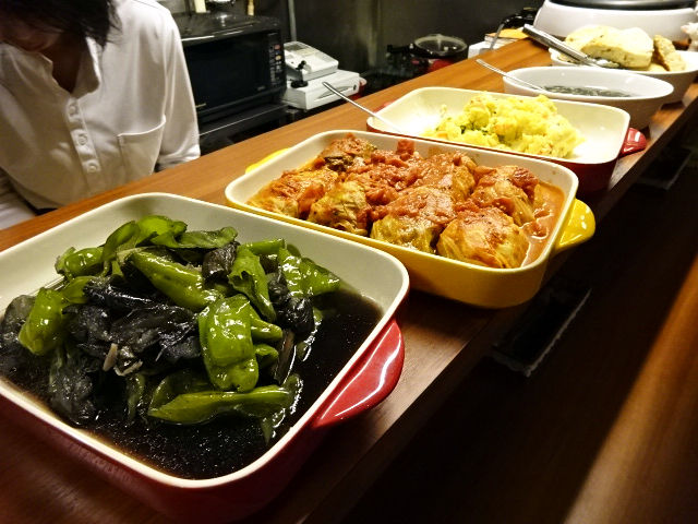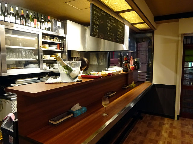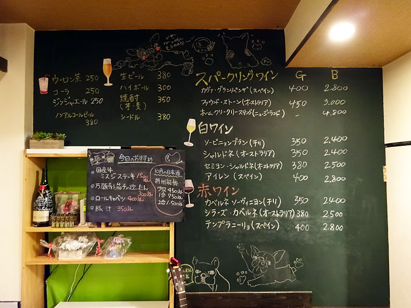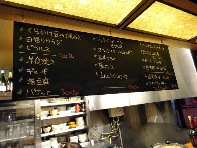 お料理は頭上黒板にて。洋ものばかりかと思いきや、餃子や湯豆腐、豚汁まであるよ(笑)そっか、おばんざい&ワインの所以ね。