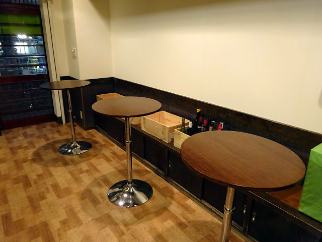 調理場向かいの低めのカウンターと、壁際の丸テーブル。オール立ちです。