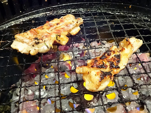 骨周りを開いたのね!ベロ〜ンッと網に乗せじっくり焼き入れます。