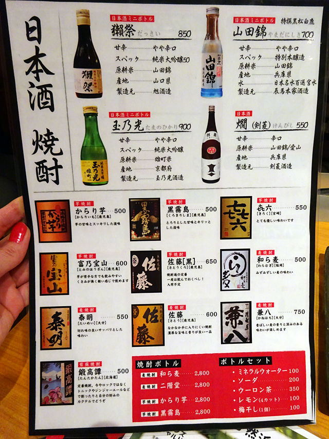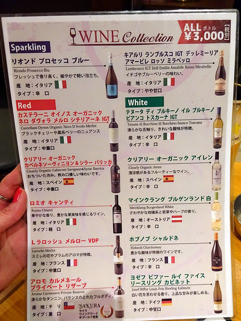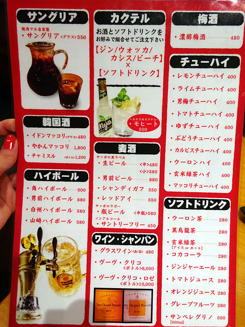 ドリンクは、ビール、チューハイ、ハイボール、日本酒、焼酎、ソフトドリンクの定番に加え、マッコリ、サングリア、カクテル、そしてワインがなかなか豊富に揃います。