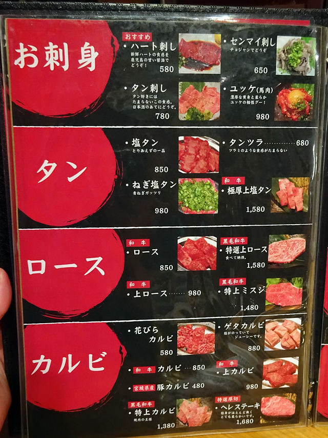 写真入りで見やすいメニュー。牛メインにホルモン、豚、鶏の焼きもん、生もん、一品、野菜、海鮮、〆もん、デザートまでスタンバイ。