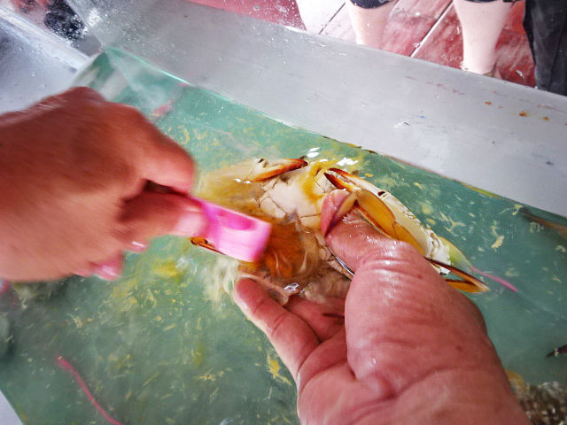 Blushing crab eggs out of its shell in order to help protect these eggs from anyone who catches crabs and let the eggs grow in the nature.