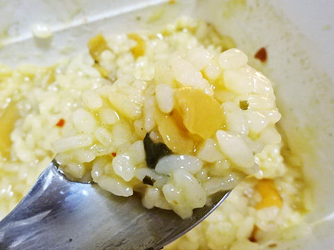 時間通りにレンチンしたら、リゾットというより雑炊orスープほど水分が残っていたので再度レンチン。で、いい感じに。
