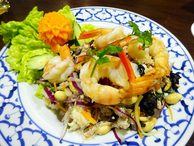 めちゃ具沢山!大きな海老に、豚ひき肉、千切り野菜などに加え、ナッツがいいアクセントに。お味は甘酸っぱくサッパリ。辛さはお店や家庭によって違うのだけど、こちらのものは程よい辛さ。