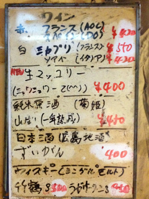 ドリンクは、生ビール¥420(瓶無し)、チューハイ各¥320、焼酎は銘柄指定無しが¥320、その他各種。ワイン、日本酒など一通り。焼酎のラインナップ多めだっけ。