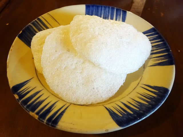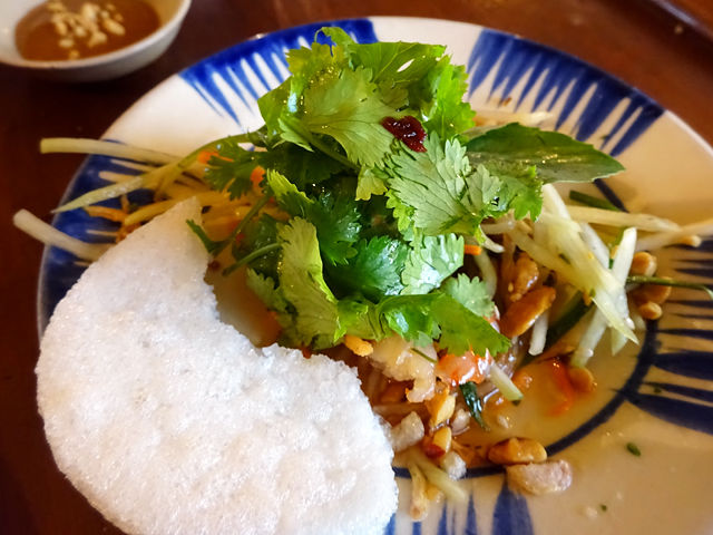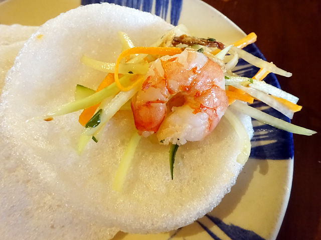 均一に千切られた野菜&パパイヤのシャキシャキッと食感にぷりぷり海老、甘酸っぱさとほんのり辛み、さっぱりとした味わい。アクセントのピーナッツも香ばしくって美味。えびせんに乗っけて食べてもまた良いのだ。