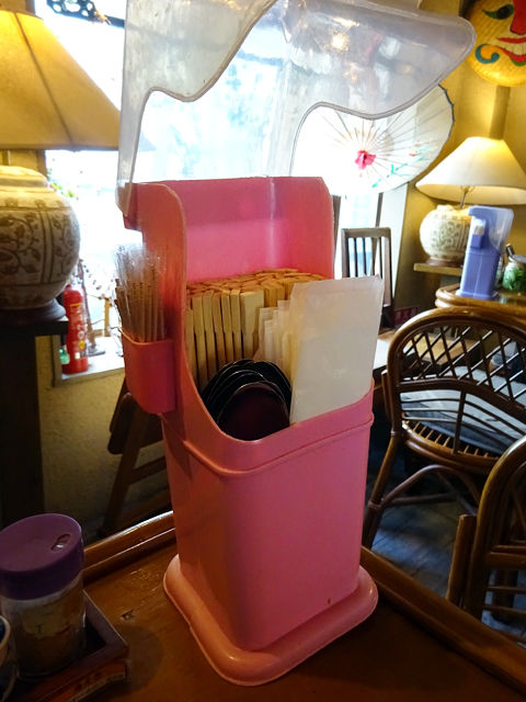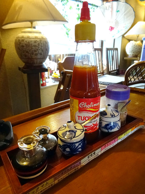 卓上にはチープでキュートな入れ物に入った割り箸、楊枝、お手拭きなどと、たくさんの調味料たち。