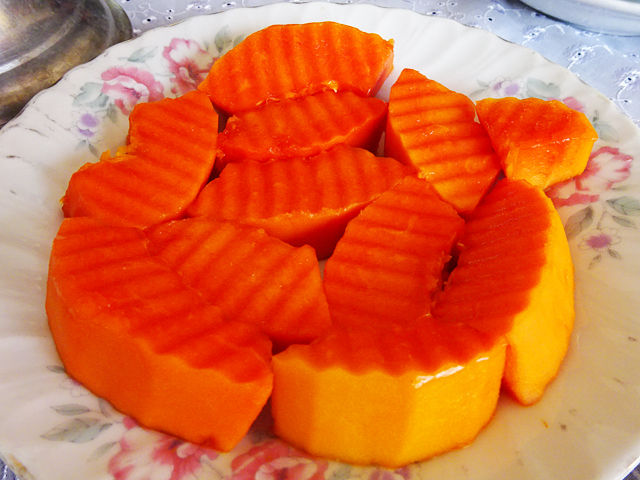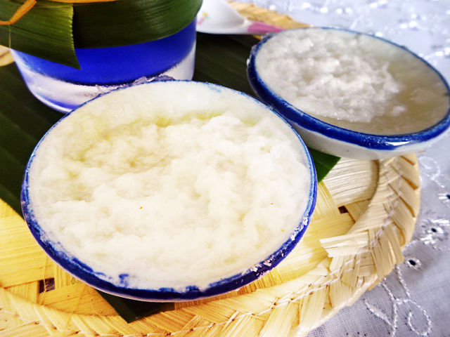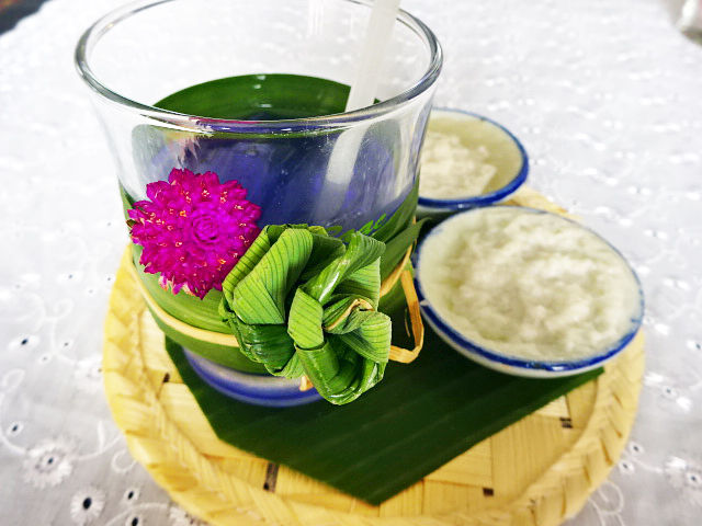 同じ器が2枚重なって出されたカノム・トゥアイは、上部にほんのり塩気のきいたココナッツミルククリーム、下部に餡?のようなものという2層になったおやつ。うーん。なるほど、な味わい(笑)
