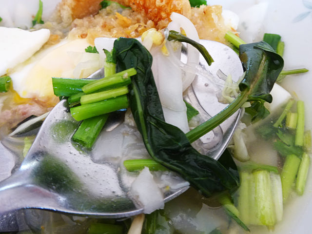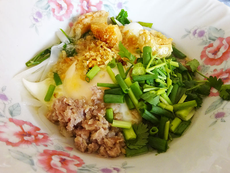 米粉と水を合わせたような液体を鉄板に薄く広げ蒸し焼きにし、クレープ状に仕上げます。そこに野菜を乗せ、最終的には細かく刻むんですね〜。スープとともにお皿に盛りつけ、各種トッピングと卵も乗っけてできあがり!