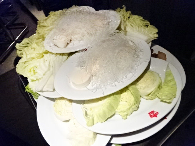 第一弾は野菜類と団子類。キャベツ、いろんなキノコ、春雨、すり身、餃子などヘルシー系がお鍋満タンに放り込まれます!(笑)そしてグツグツ煮えたぎるほどに煮えたぎらせ、一気に皿に盛りつけられます。