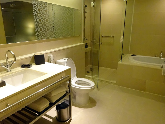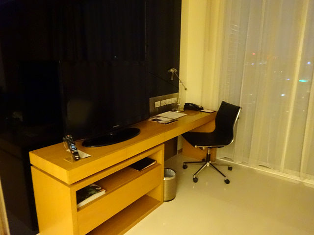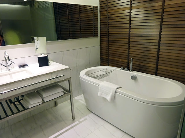 入り口すぐにダイニング&キッチン、その奥にリビング&デスク。窓からはもちろん絶景が!入り口左手のバスルームも広ーい!バスタブあり、アメニティも揃います。そして最奥にベッドルーム。クローゼットや金庫、アイロンなど生活に必要なものがほとんど揃って、やっぱりここは家だ!(笑)