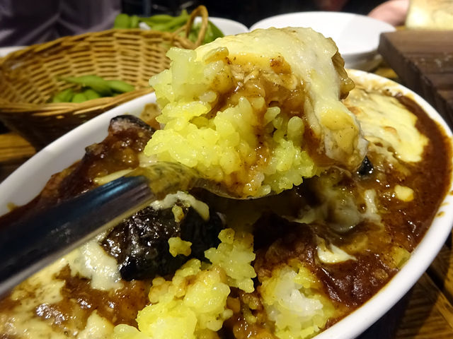 ターメリック(サフランか?w)ライスにスパイシーでコクのあるカレー、たっぷりチーズがとろけからまるこの旨さ!腹パンの他方を横目にひとりがっついてもた!(笑)