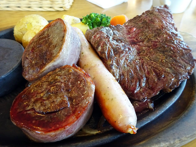 どんステは牛サガリにベーコンを巻いたステーキ。肉厚ながらやわらかで、あっさり目の肉とベーコンの旨み脂身のコンビネーションがGOOD!
