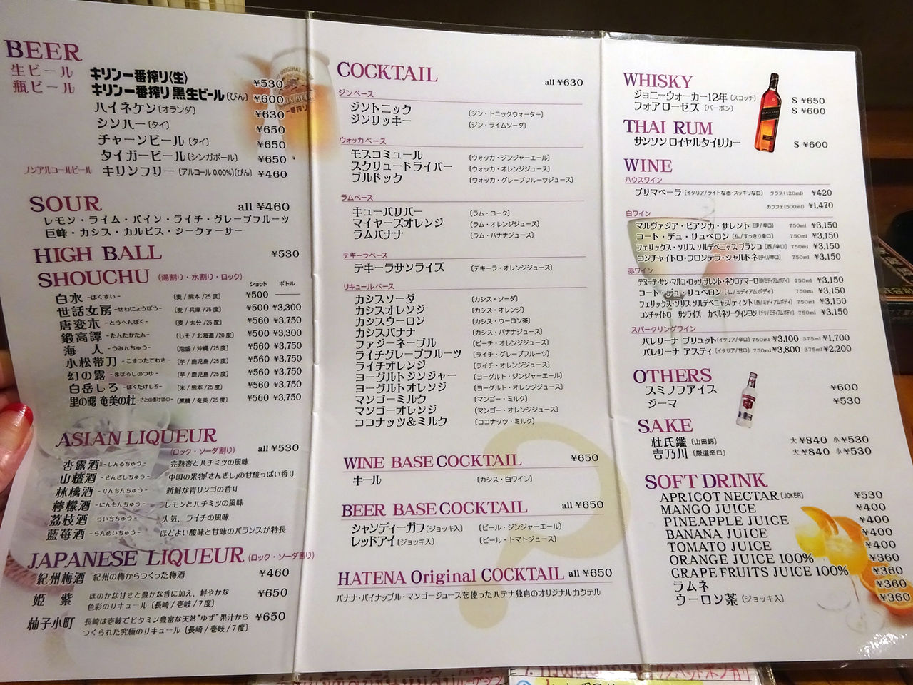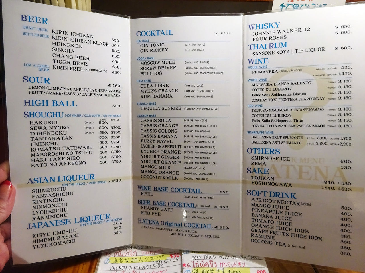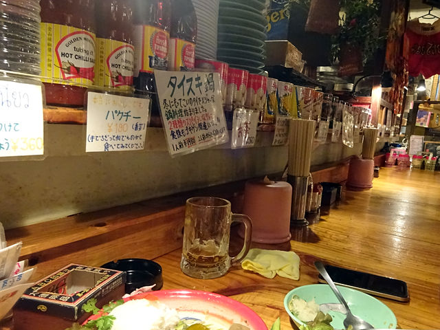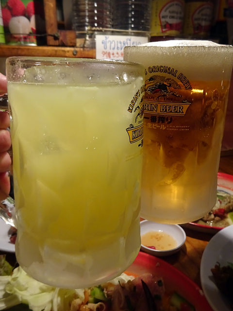 ドリンクは生ビール(キリン)¥530、黒ビール(瓶)¥600の日本物に加え、タイビールのシンハー・チャーン各¥650(瓶)、シンガポールのタイガー¥650、ハイネケン¥630などももちろんスタンバイ。その他、サワー各¥460、ハイボール¥530、焼酎各¥500〜、果実酒各¥530、カクテル各¥630〜、ウイスキー、ワイン、日本酒などと、ソフトドリンク¥360〜。