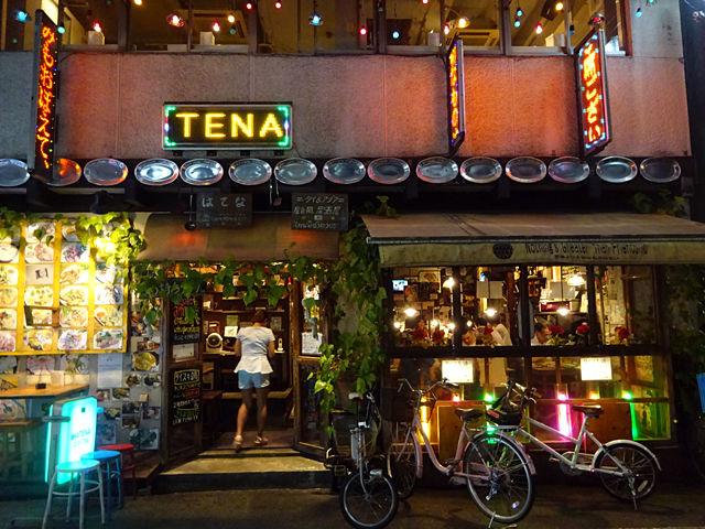 日中はシンプルなカフェ風なのだけど、夜になってライトアップされると良い雰囲気!チャリが停めてあるけど、チャリ通いの人もいるのかな?(笑)