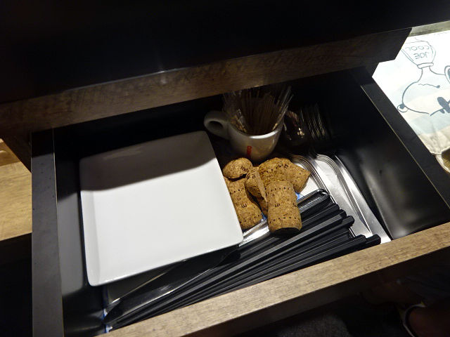限られたスペースを有効利用、カトラリーやお皿等は引き出しに収納ね。
