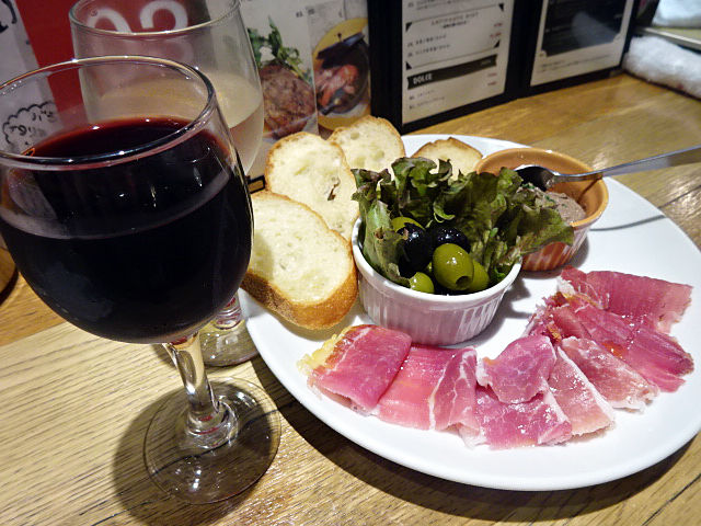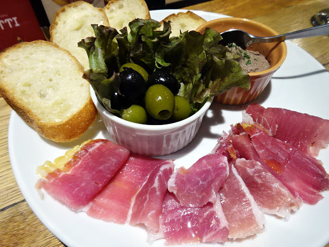 で、オリーブ2種・自家製レバーのパテ・プロシュート+バゲット