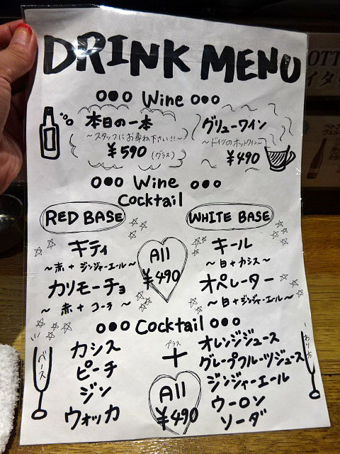 メインのワインはグラス¥390〜、ボトル¥2900〜、泡¥590〜。カクテル&サングリアALL¥490、ビール、ハイボール各¥490、ソフトドリンク¥290など。定番に加え、その日オススメのワイン、カクテルもスタンバイ。