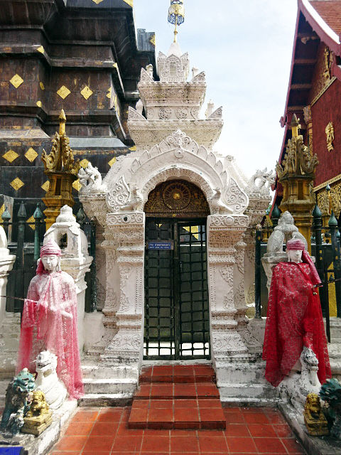 45mもあるという立派な仏塔。その周囲を金色の灯籠がぐるりと囲い、仏塔の4隅にはタイ北部寺院のシンボルだという傘飾りがそびえます。