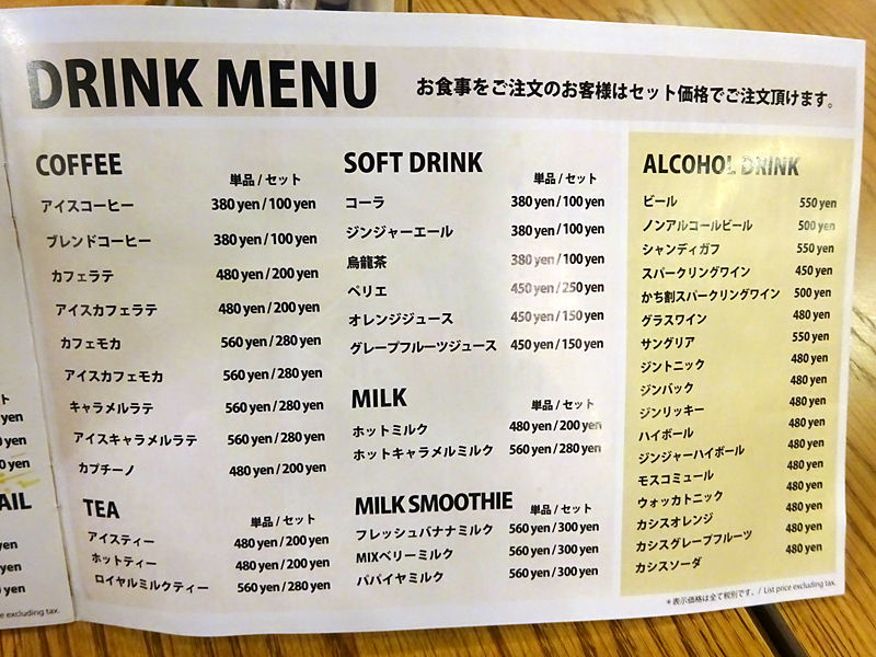ドリンクはコーヒーは+¥100、その他はメニューでチェック。