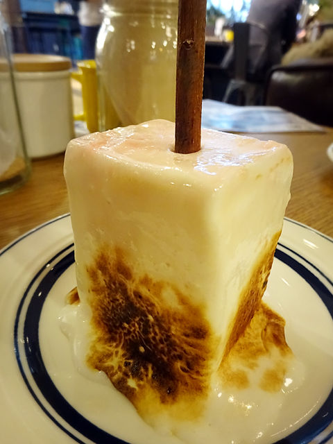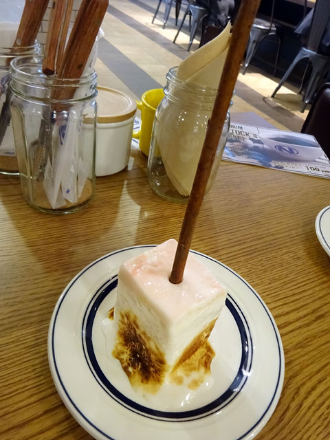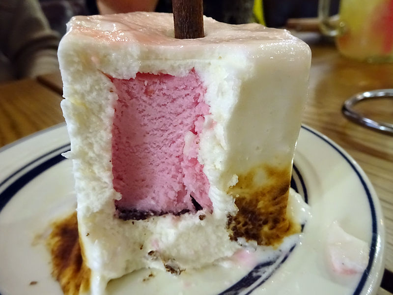 こちらも思ったより小さめ。マシュマロはこんがり焼かれているものの、パリッと感はなく、熱くもないんだ。そのぶ厚いマシュマロの中にストロベリーアイス。かなり甘いので、相当な甘党さん向けかな!