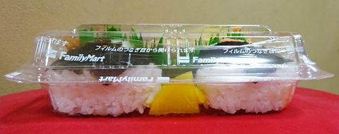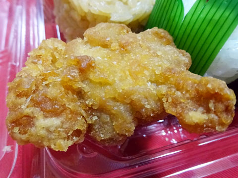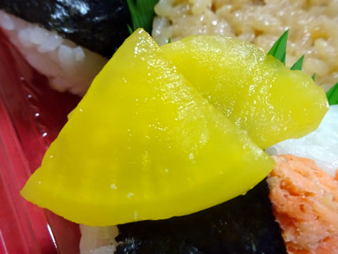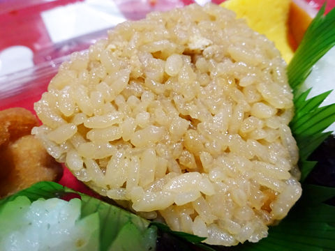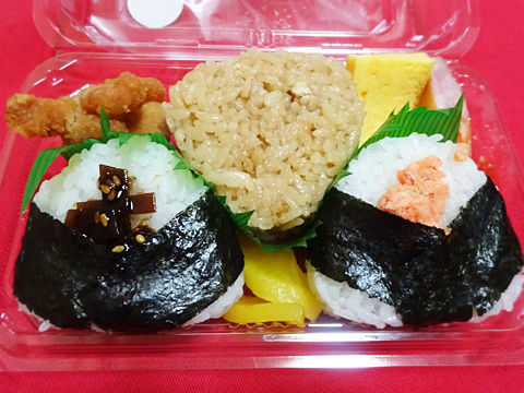 原材料:塩飯(国産米使用)、具入り味付ご飯(うるち米(国産)、醤油だれ、油揚げ、たけのこ、その他)、鶏唐揚、卵焼、ウインナー、たくあん、ごま入り昆布佃煮、紅鮭ほぐし身、ケチャップ、海苔、‥