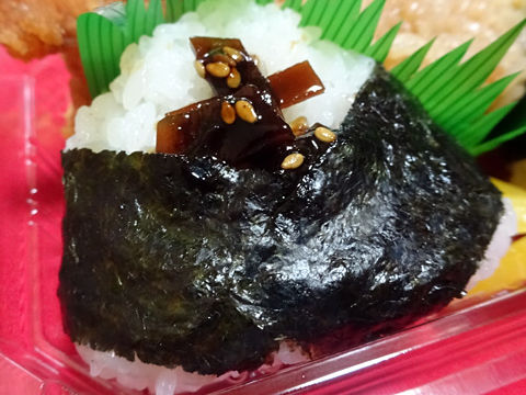 各おにぎりは若干小さめ。昆布、鮭はそれぞれ具材オンザスタイル。かやくご飯(具入り味付と書いてある)は、ちんまい油揚げと筍だけだけど、味はしっかりついてた。