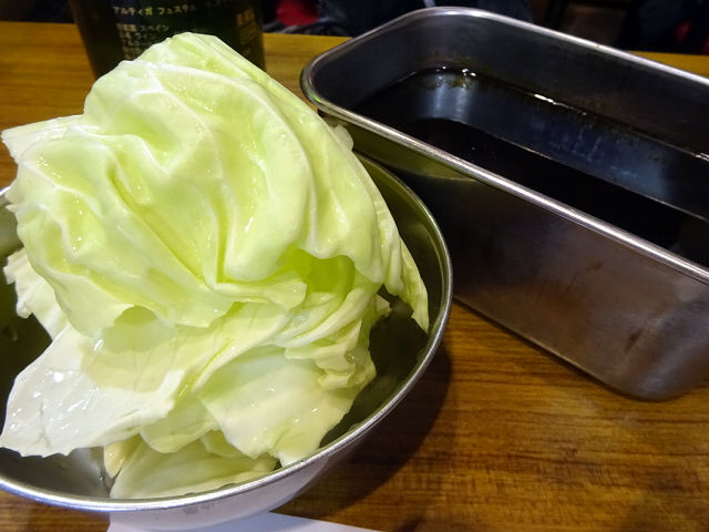 ソースは常時スタンバイの二度漬け禁止タイプ、キャベツはサービス。