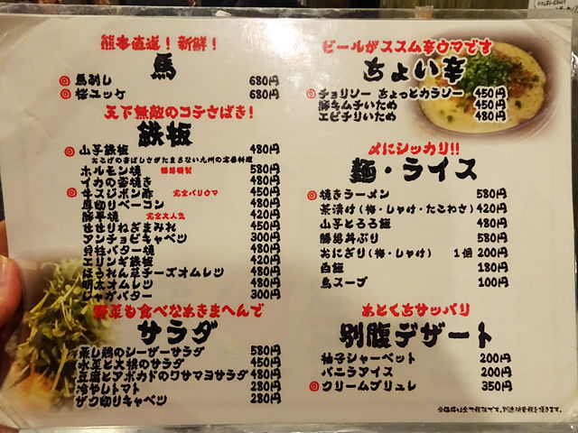 メニューは手元パウチにて。先述通り、数種のからあげをメインに、一品、馬肉、鉄板もん、サラダ、〆もん、デザートなど。