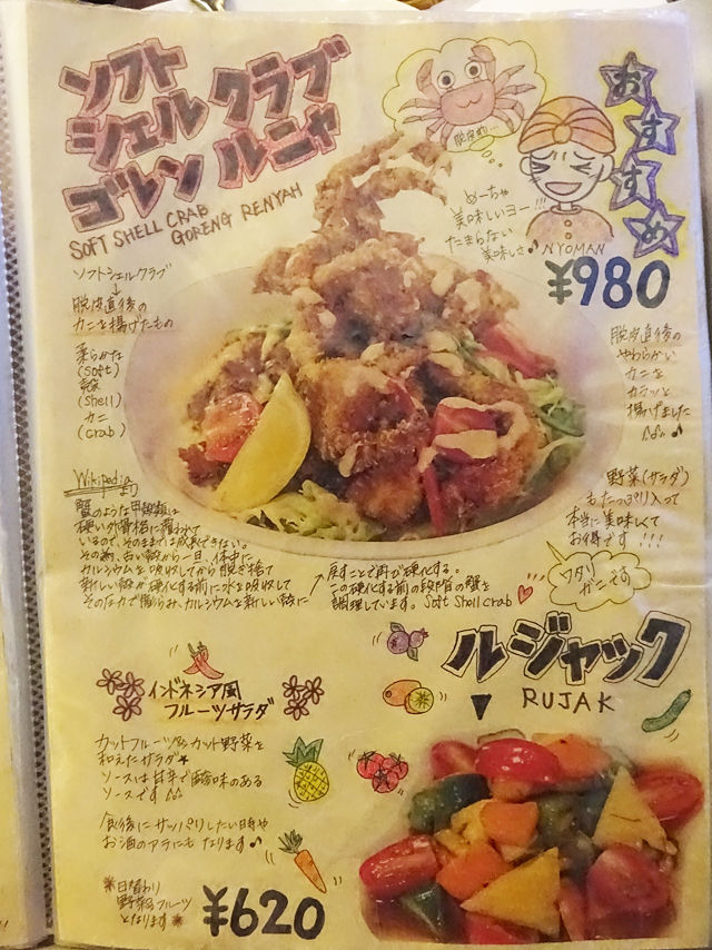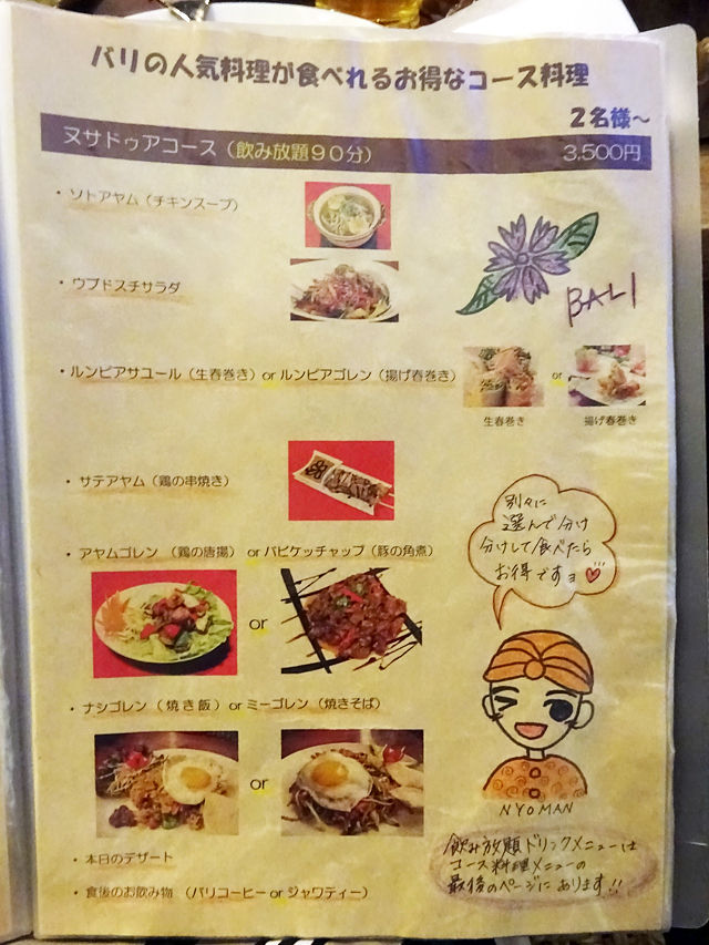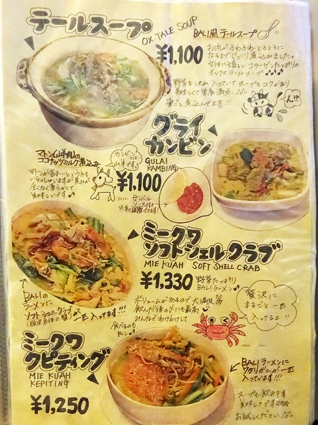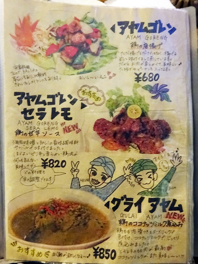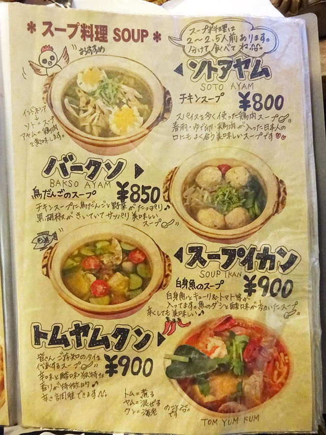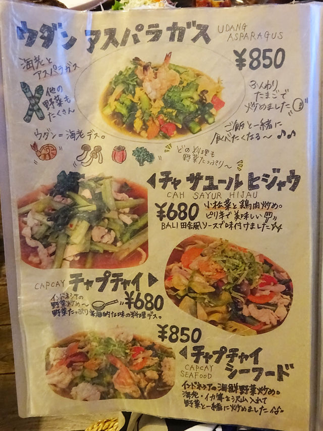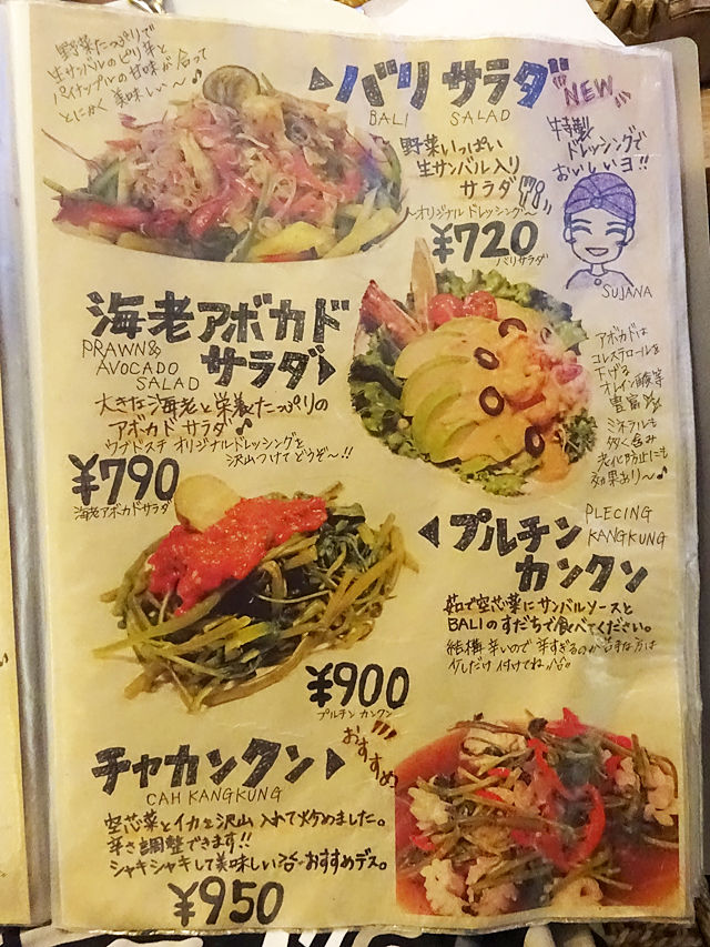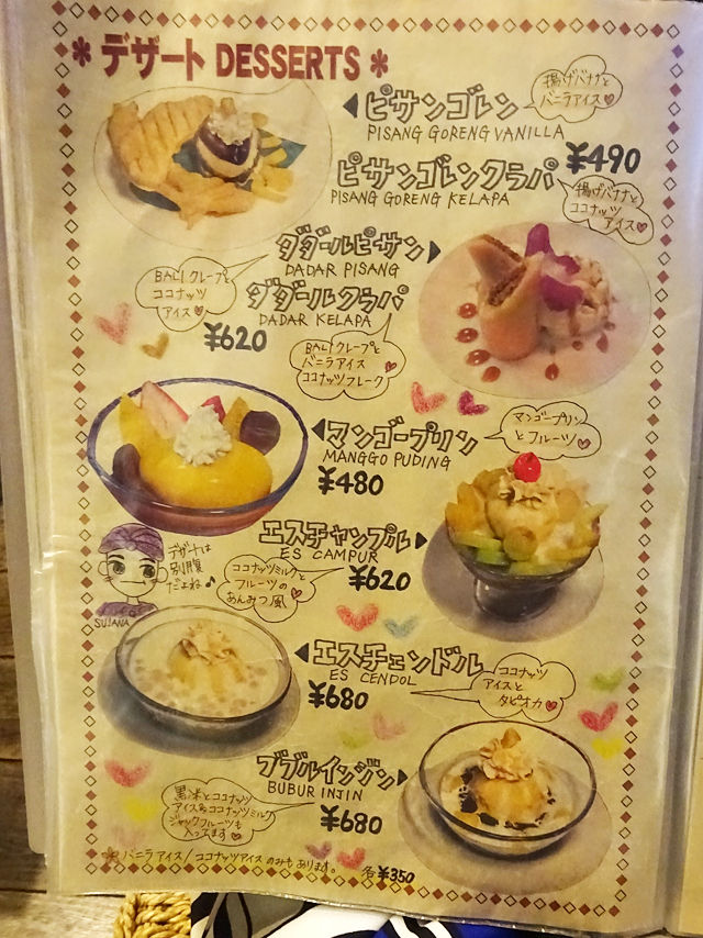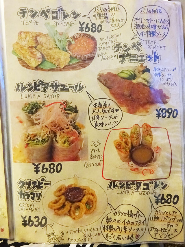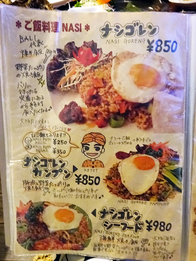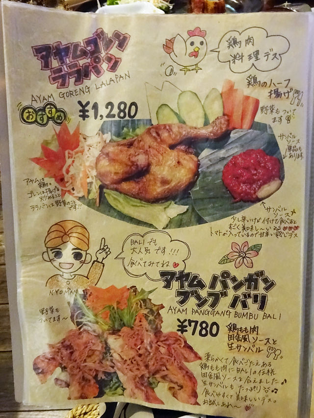 気になるメニューは手元の何十ページにもわたるブックにて。バリの五つ星ホテルで料理長を勤めた経験をもつシェフが作る本格インドネシア・バリ料理は70種類以上!すごー!!写真とイラストの説明入りで分かりやすく、見ているだけでも楽しいのです。(記事最下部にて)