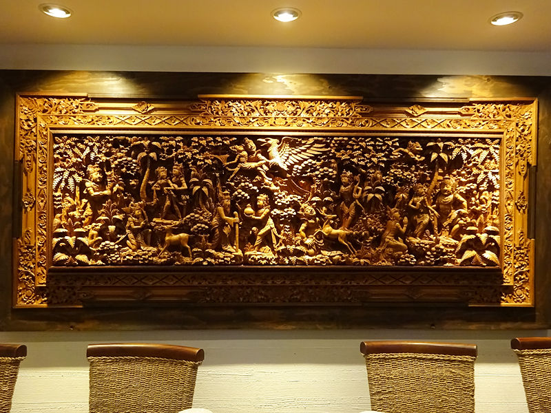 中央に掲げられる立派な木彫りに木材のテーブルセット、各所に飾られる雑貨アートなどなど、インドネシア・バリ島の雰囲気たっぷり。