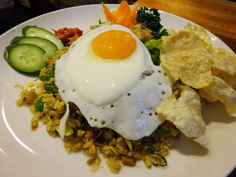 インドネシア料理と言えば、ナシゴレンよね。野菜たっぷりの焼き飯に、こちらは豚肉入りバージョンだって。