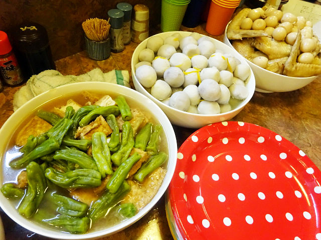 厚揚げとシシトウの煮物、里芋と柚子の煮物、手羽先とウズラ卵の煮物
