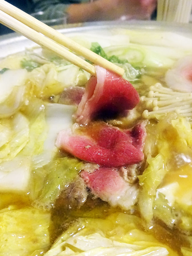 一般的には味噌味で臭みを消すのがぼたん鍋だけど、こちらでは醤油味でもいただける=臭みが全くない!のだ!豚肉に似て非なる肉。赤身と白身(脂身)のセパレート感もジビエを感じさせるね。コクがあるのにしつこくなくって、でも味わい深くって、ほんとーにおいしい!!