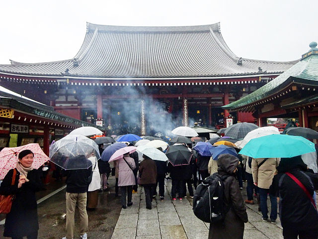 仲見世通り。大好き!あっちやこっちや見たいのに、もう、人と傘で何も見えへん!傘もぶつかるし顔面にぶつかるし、超最悪!結局どの店を見ることもできませんでした。ガックシ!!