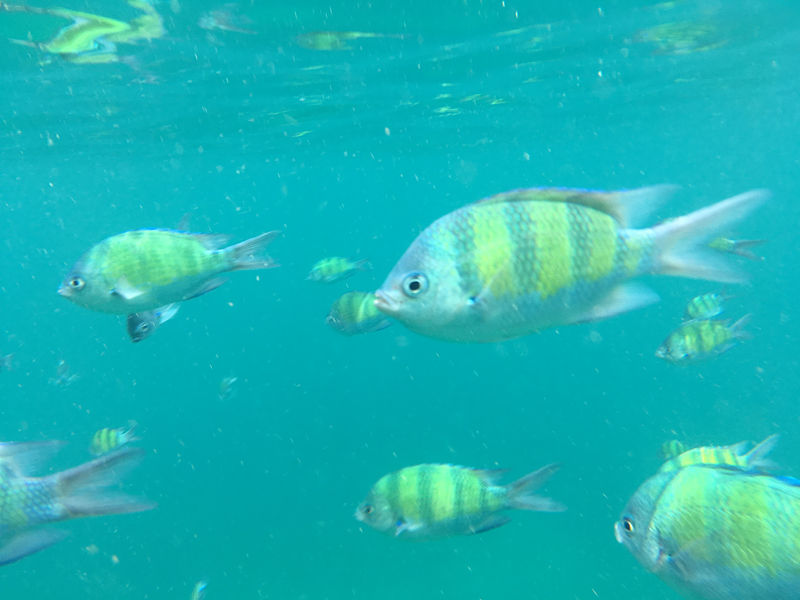 水がちょっと濁っていたため、写真や動画で見るような超美しい光景を見ることはできなかったのですが><それでも水面近くでこんなにキレイな魚を見られるなんて!感激!!!
