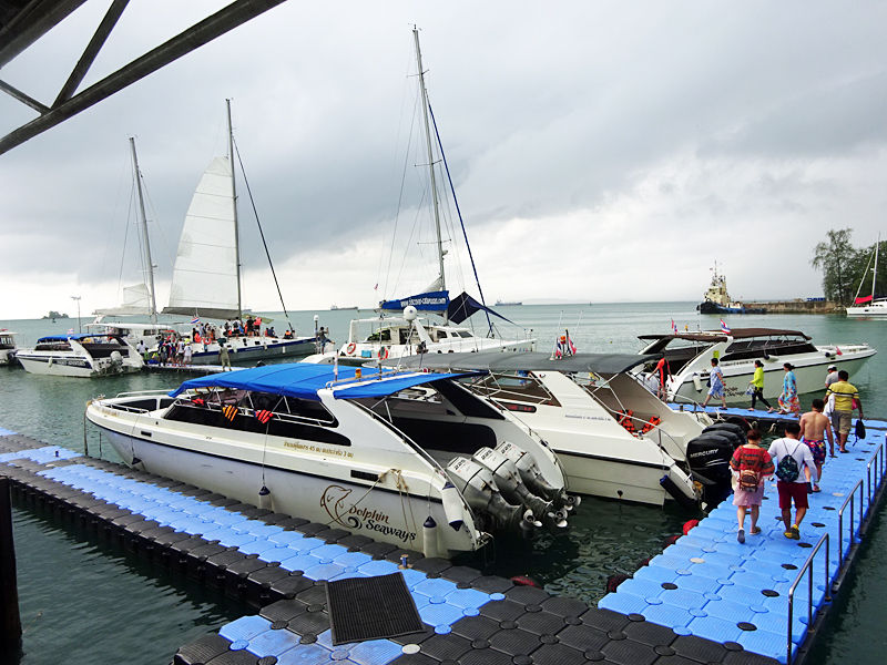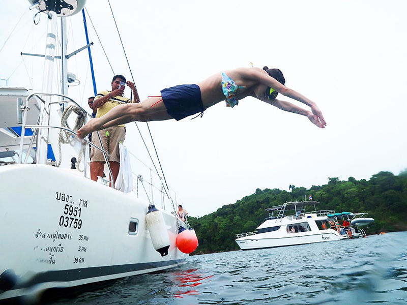 プーケット内の指定の桟橋でピックアップされ、カタマラン(双胴船=2つの船体を真ん中で繋いだ船)で、プーケットから南東へ約16kmの小さな島、マイトン島へと向かいます。